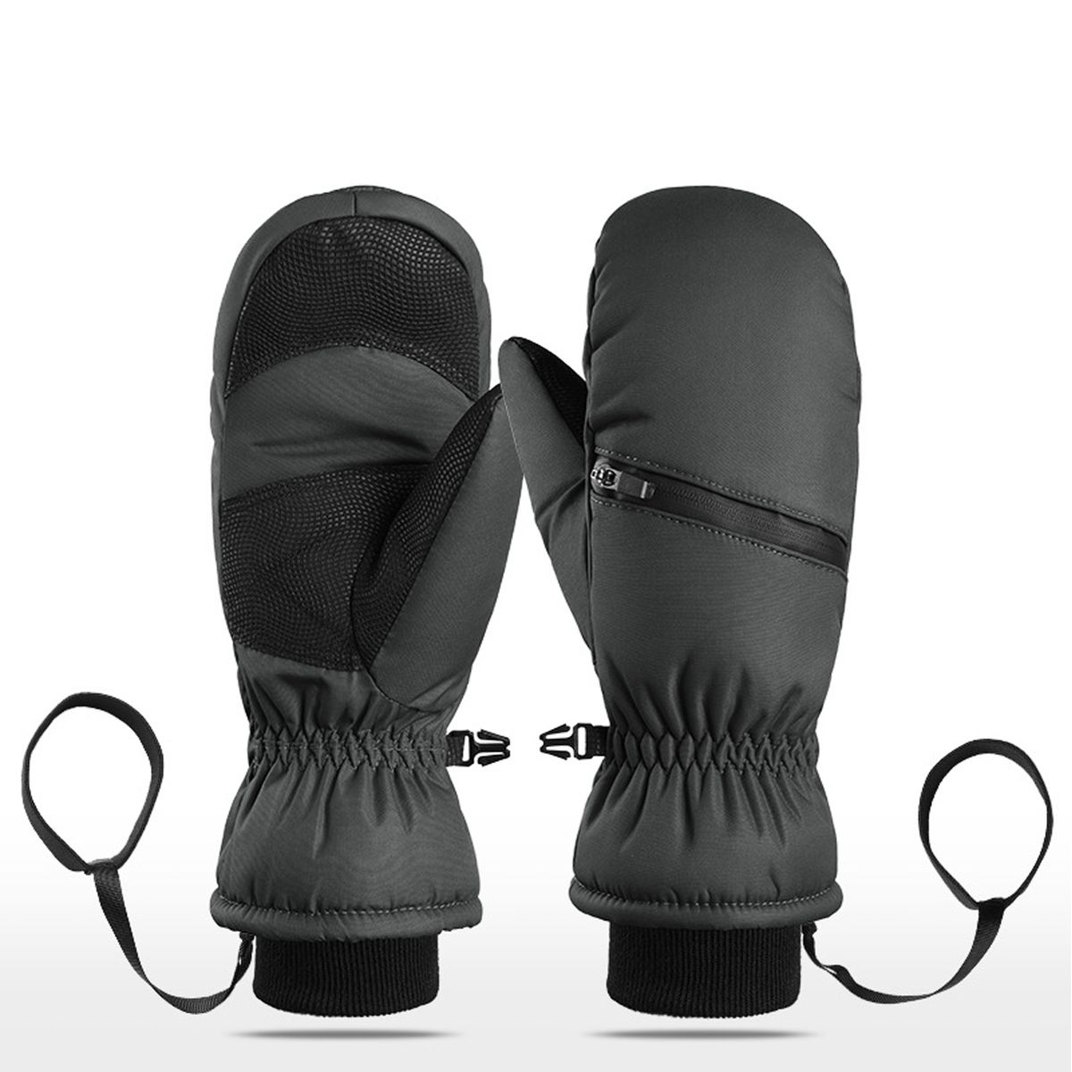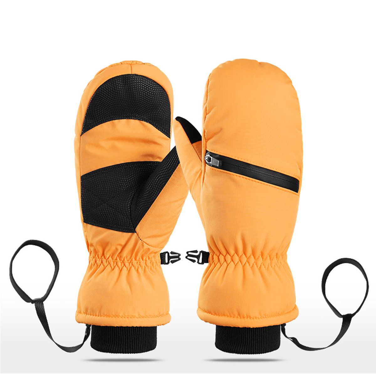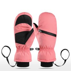 These ski gloves use a six layer thermal build that combines a nylon exterior, waterproof membrane, cushioning sponge, and insulation cotton with a soft fleece lining for heat retention. The windproof, waterproof structure helps block snow and moisture during outdoor sport. Adjustable wrist straps and elastic cuffs lock in warmth, while a practical buckle clips the pair together to reduce loss. They are suitable for skiing, snowboarding, hiking, cycling, or other winter activities.
